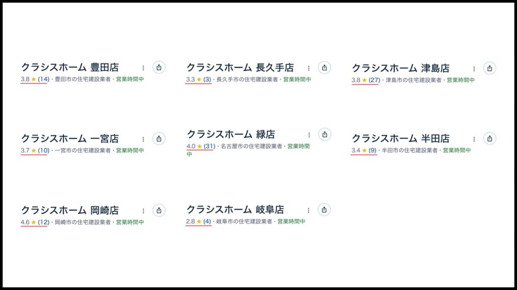 愛知県を中心に展開をしているので、愛知県の店舗の方がクチコミ数が多く評価も高いです。